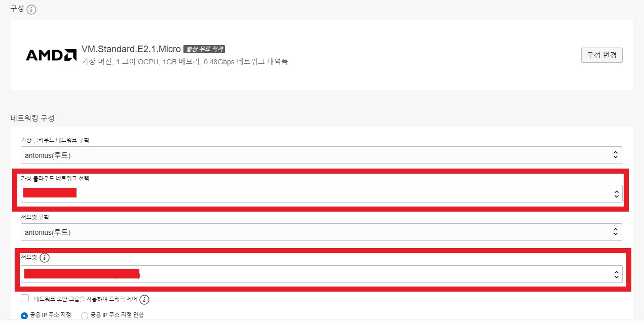 구성, 네트워크 및 스토리지 옵션 표시 클릭 후 가상 클라우드 네트워크 선택과 서브넷에 처음 네트워크 설정할때 생성한 VCN이 선택되어 있는지 확인 합니다.