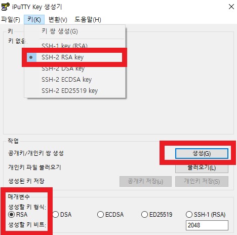 SSH-2 RSA key, 매개변수(RSA) 선택 후 생성을 클릭합니다.
