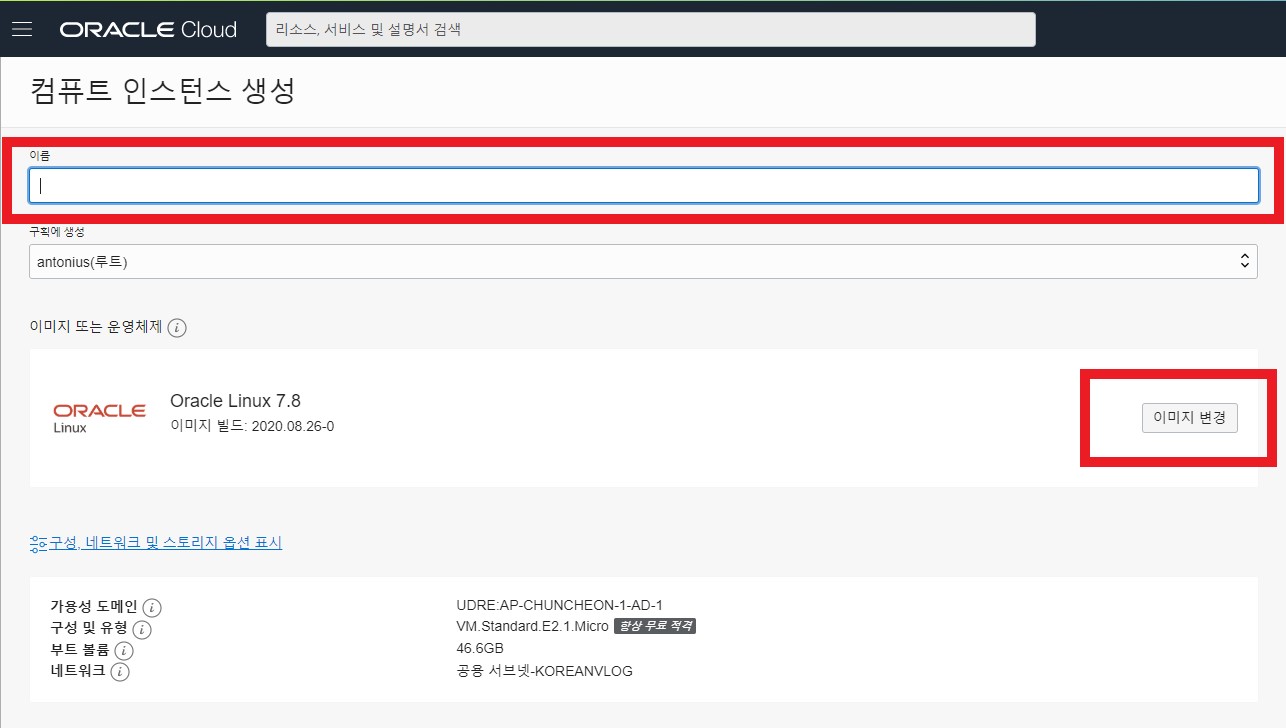 인스턴스 이름을 작성하고 이미지 변경 클릭 합니다.