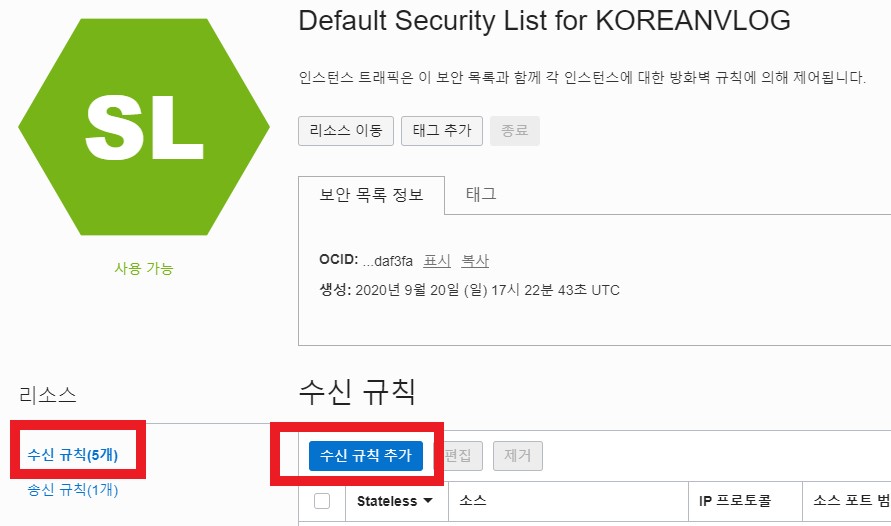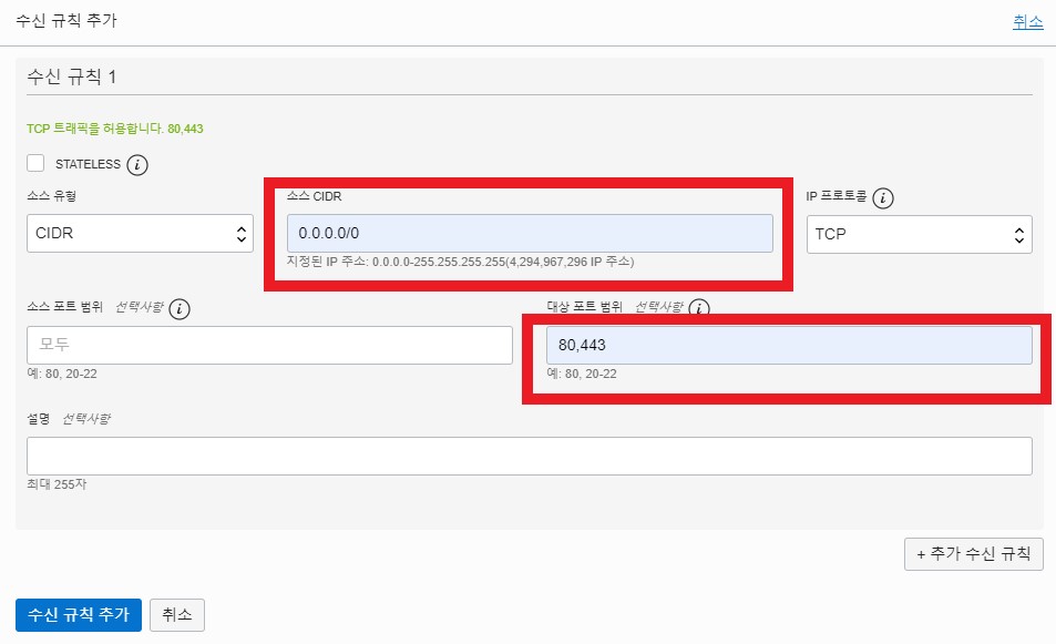 소스 CIDR, 대상 포트 범위를 똑같이 작성 후 수신 규칙추가를 클릭합니다.