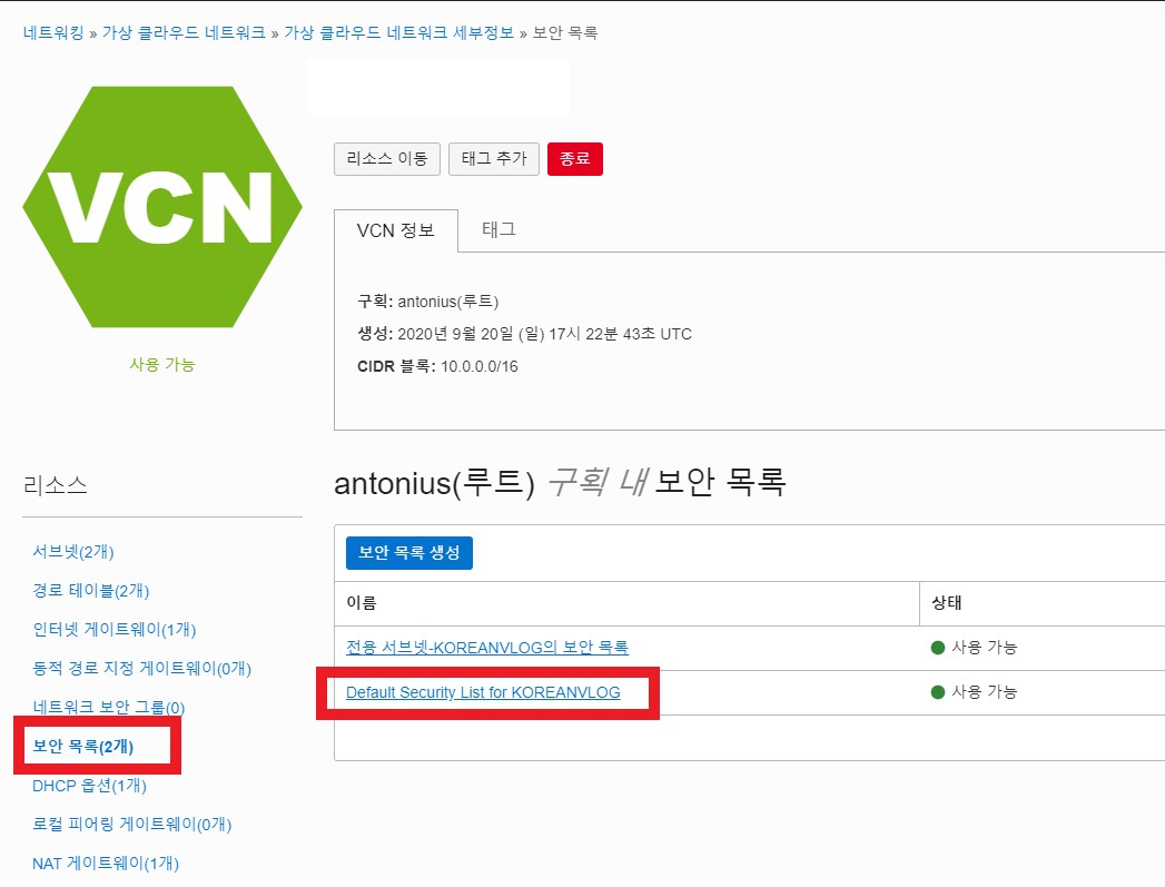 네트워킹 > 가상 클라우드 네트워크 > 생성한 VCN명 클릭 후