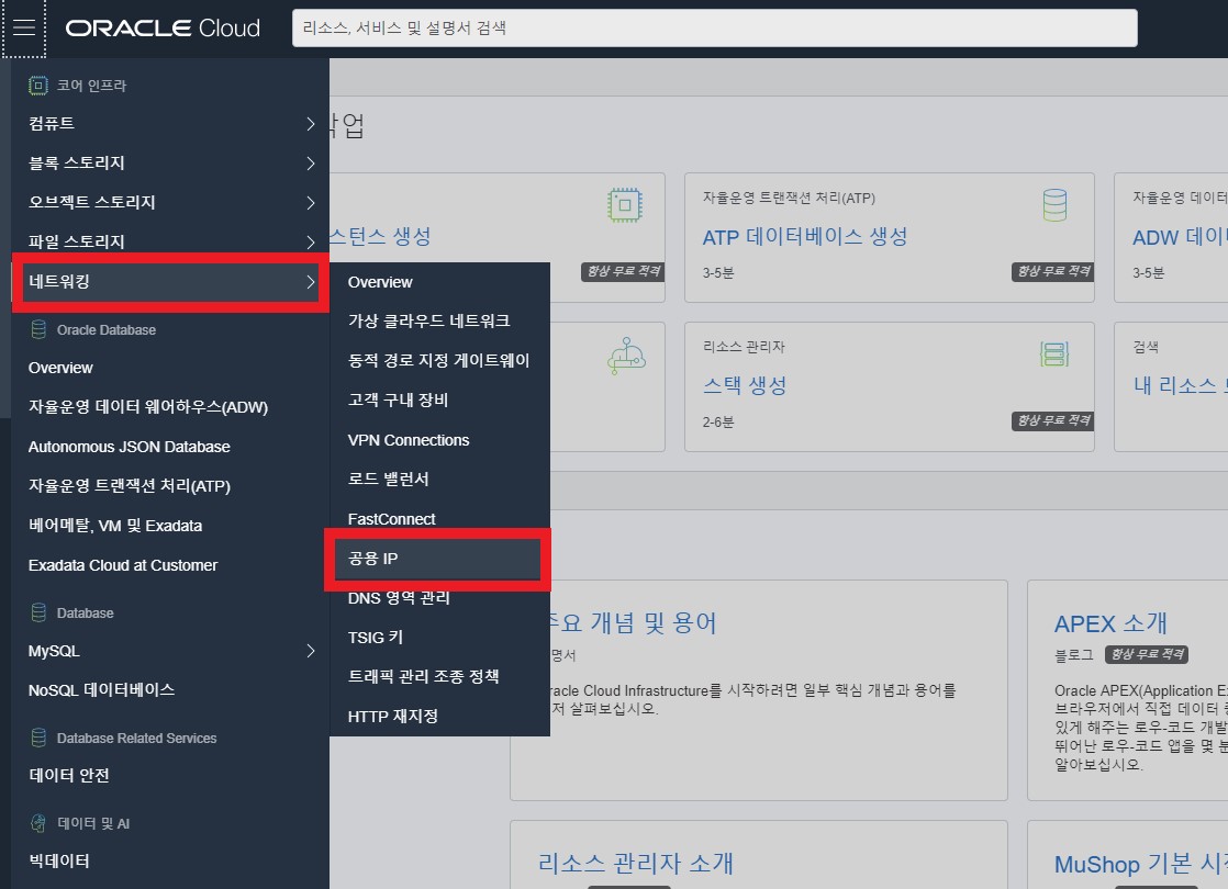 인스턴스가 생성 되었으면 네트워킹 > 공용 IP를 선택합니다.
