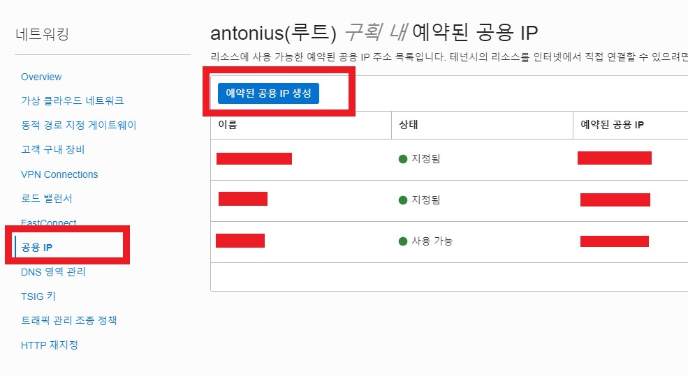 공용 IP > 예약된 공용 IP생성을 클릭합니다.