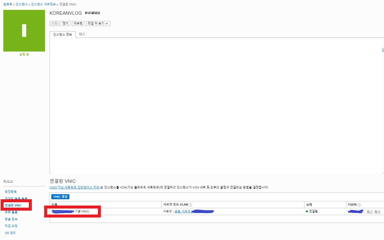 아래쪽 연결된 VNIC에 네트워크 설정때 생성한 VNIC를 클릭합니다.