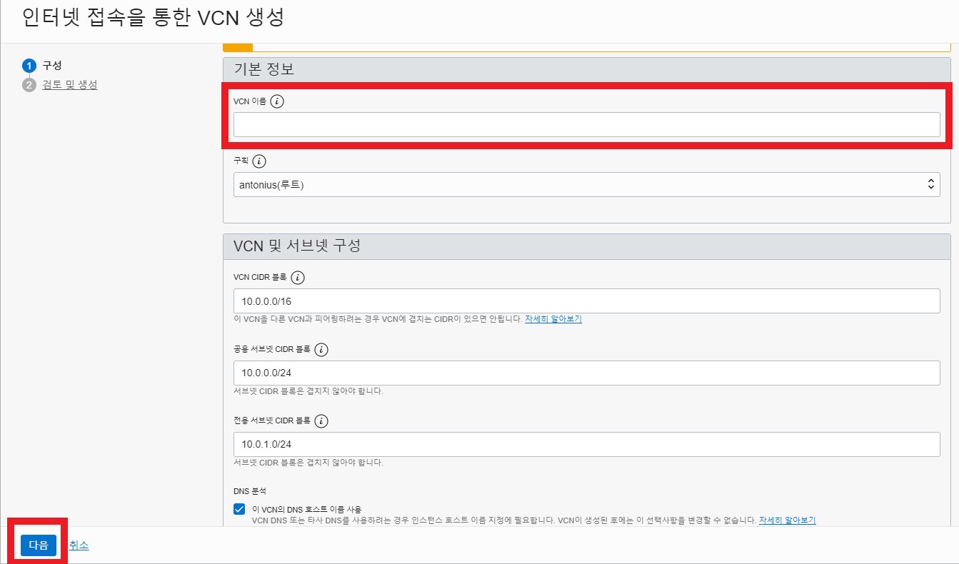 VCN 이름을 적고 좌측 아래 다음을 클릭 후 생성까지 클릭해줍니다.
