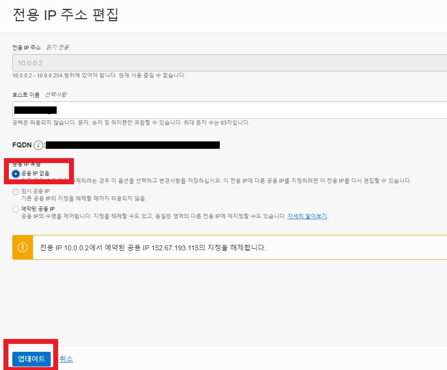공용 IP 없음을 선택 후 업데이트 합니다.