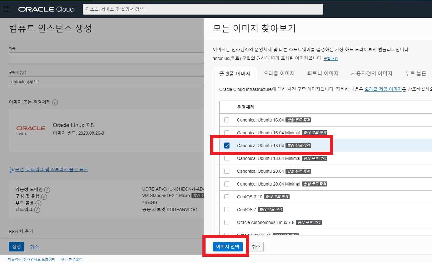 Canonical Ubuntu 18.04 선택하고 이미지 선택 클릭 합니다.