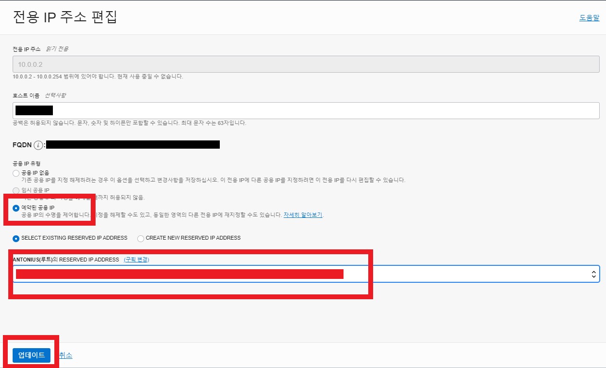 다시 편집에 들어가서 예약된 공용 IP 선택 후 RESERVED IP ADDRESS에 아까 생성한 공용 IP를 선택합니다. 왜 두번 일을 하냐라고 하실 수도 있는데 오라클 클라우드는 바로 예약된 공용 IP선택이 안됩니다. 공용 IP 없음을 선택했다가 다시 편집해야 예약된 공용 IP 선택이 가능합니다.