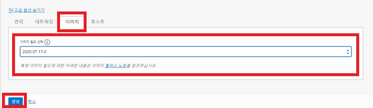 이미지 선택 후 이미지 빌드 날짜를 2020.07.17로 선택 후 생성을 클릭 합니다.