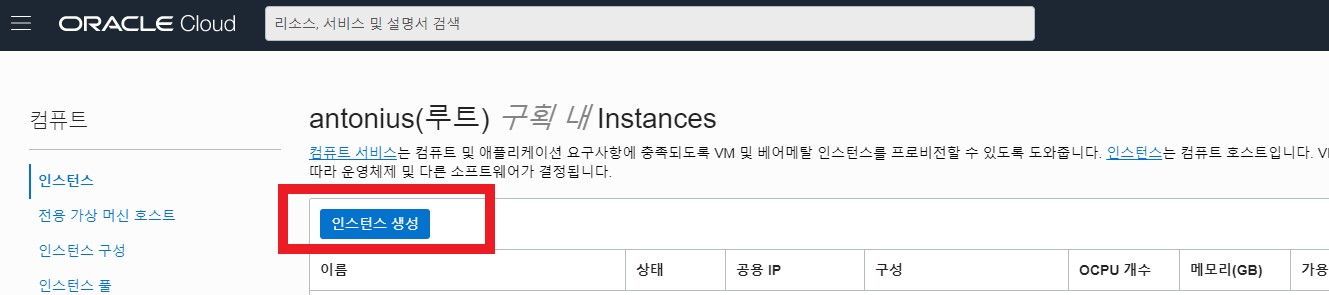 인스턴스 생성 클릭
