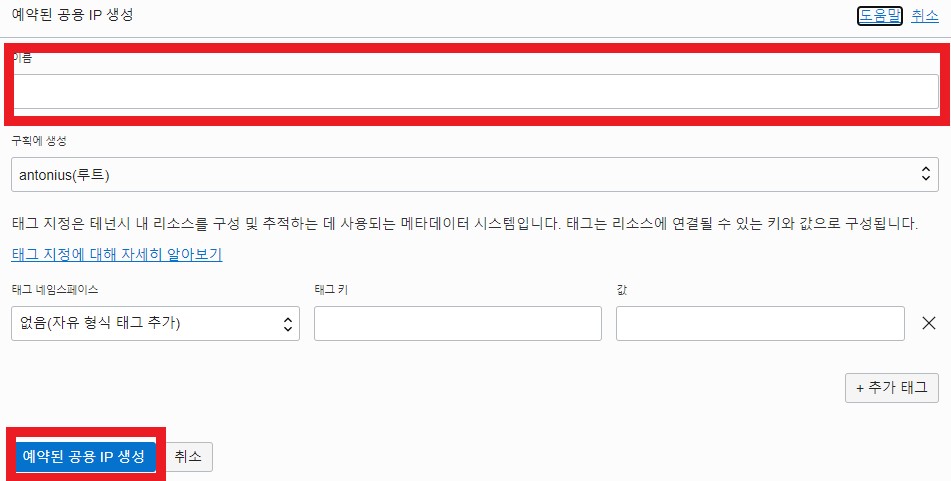 공용 IP 이름을 적고 예약된 공용 IP 생성을 클릭합니다.