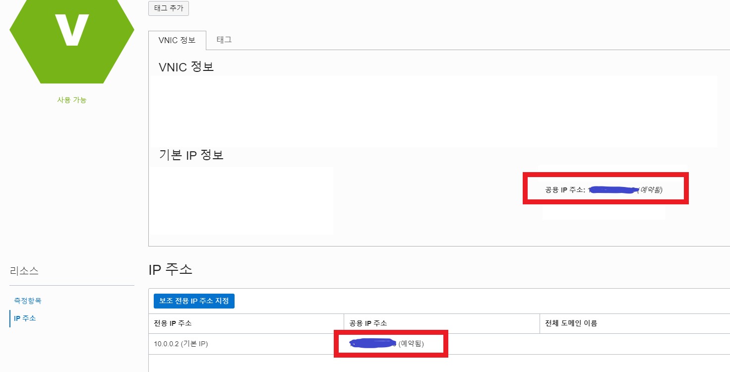 인스턴스 공용 IP 주소가 예약된 공용 IP주소와 일치하면 네트워크 설정과 인스턴스 생성은 모두 완료 된겁니다.