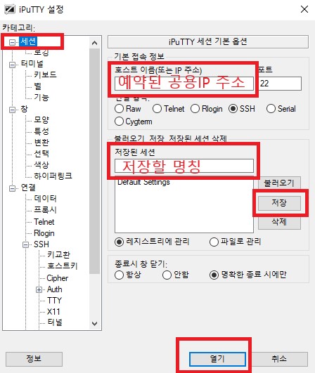 세션 메뉴 선택 후 호스트 이름에는 예약된 공용IP 주소를 입력합니다.